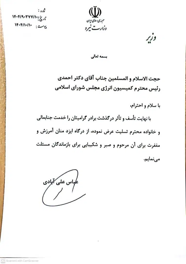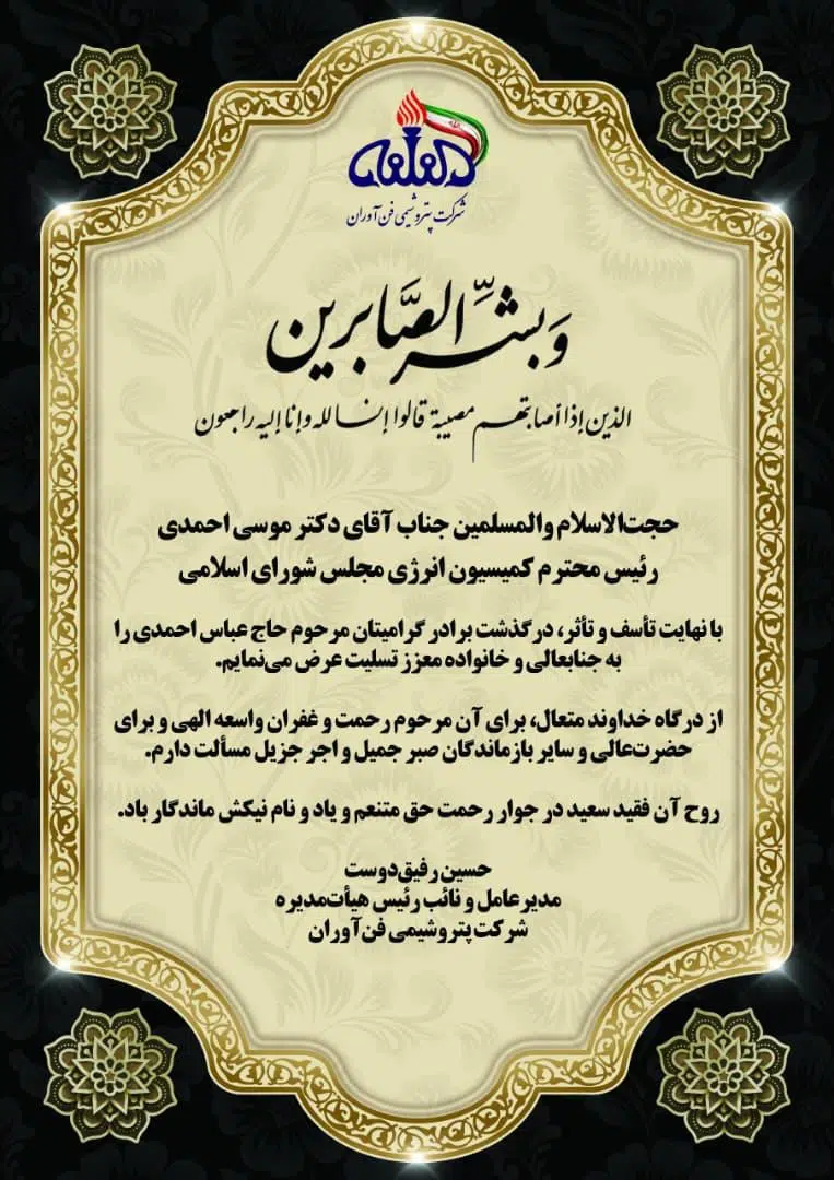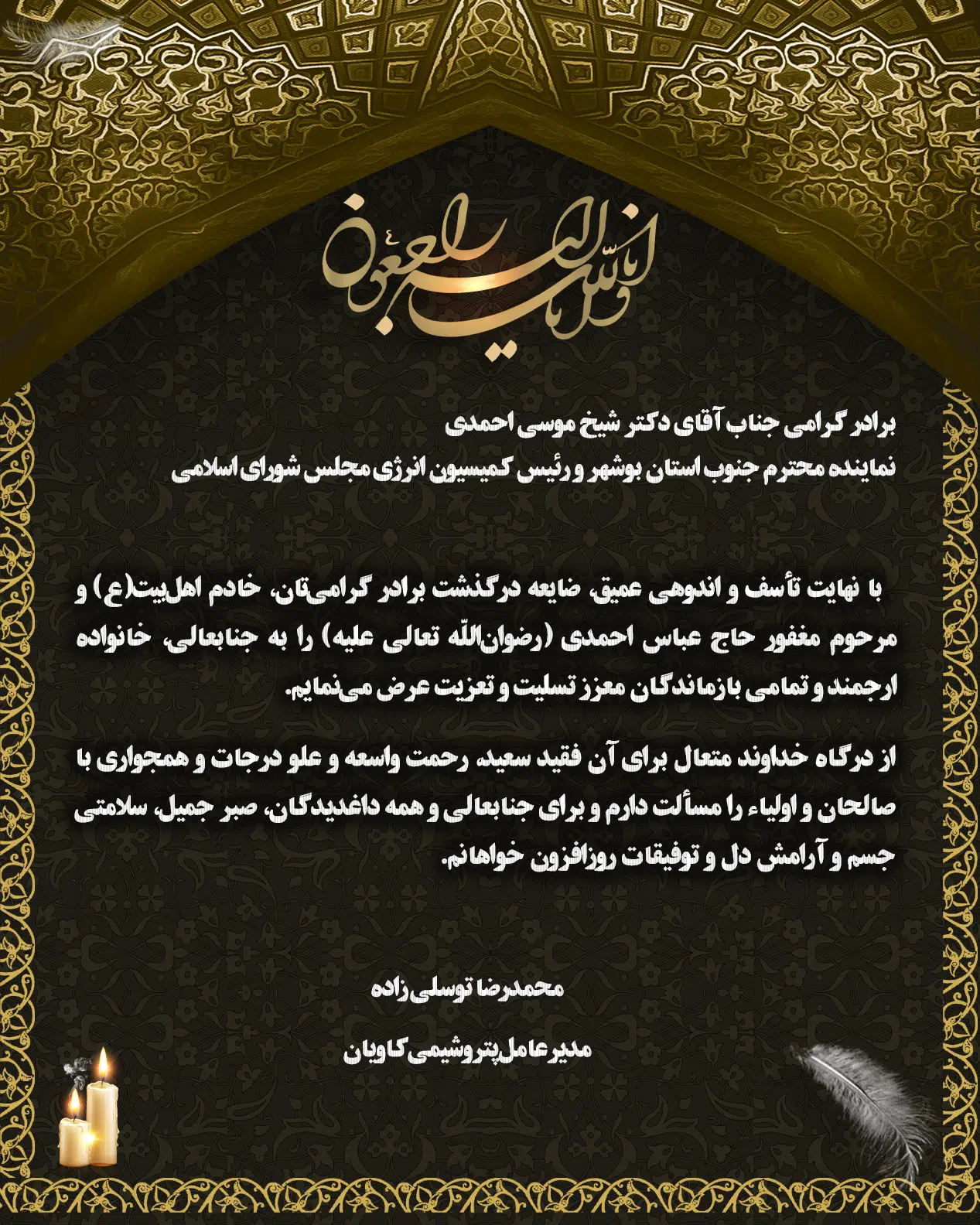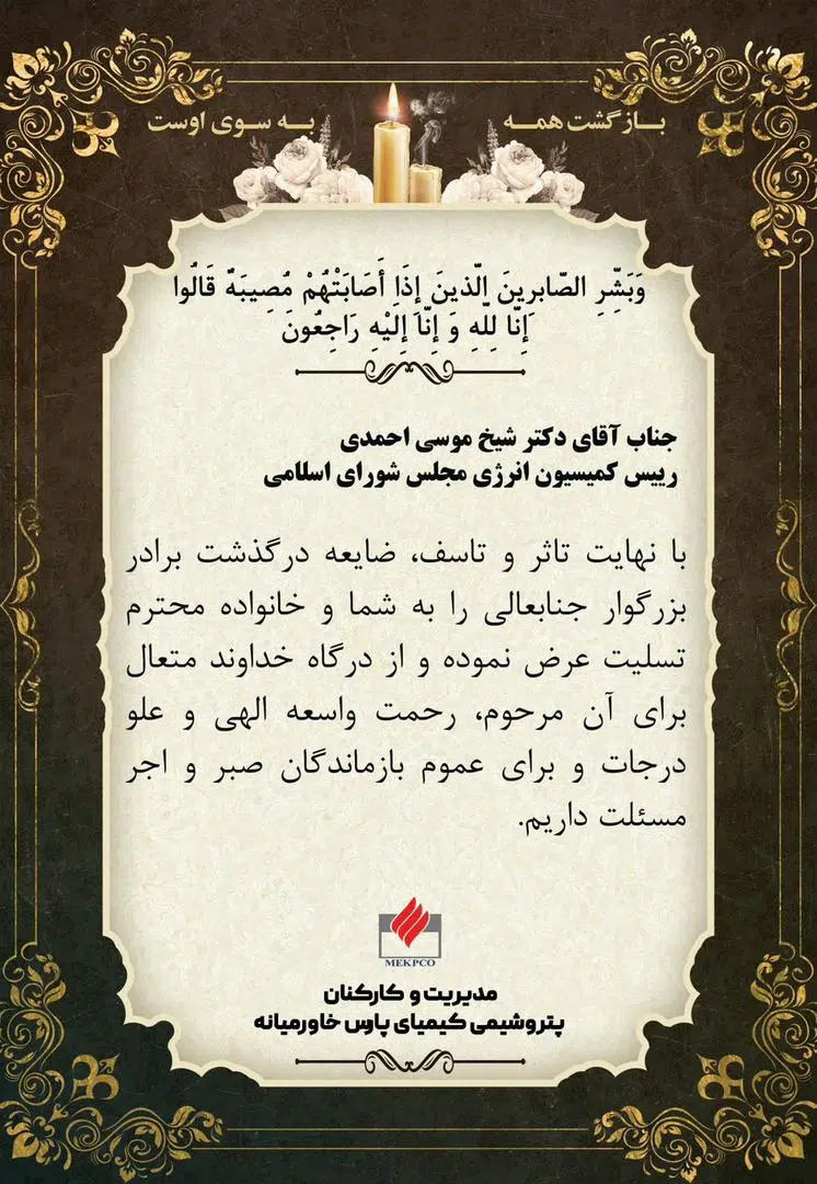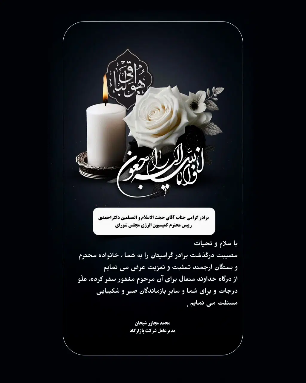 رسانه موج انرژی ضمن ابراز همدردی صمیمانه، این ضایعه جانکاه را به ایشان و خاندان محترم تسلیت عرض نموده و از درگاه حضرت حق، برای آن فقید سعید، رحمت واسعه و علوّ درجات، و برای جنابعالی و بازماندگان معزز، صبر جمیل و اجر جزیل مسئلت مینماید.