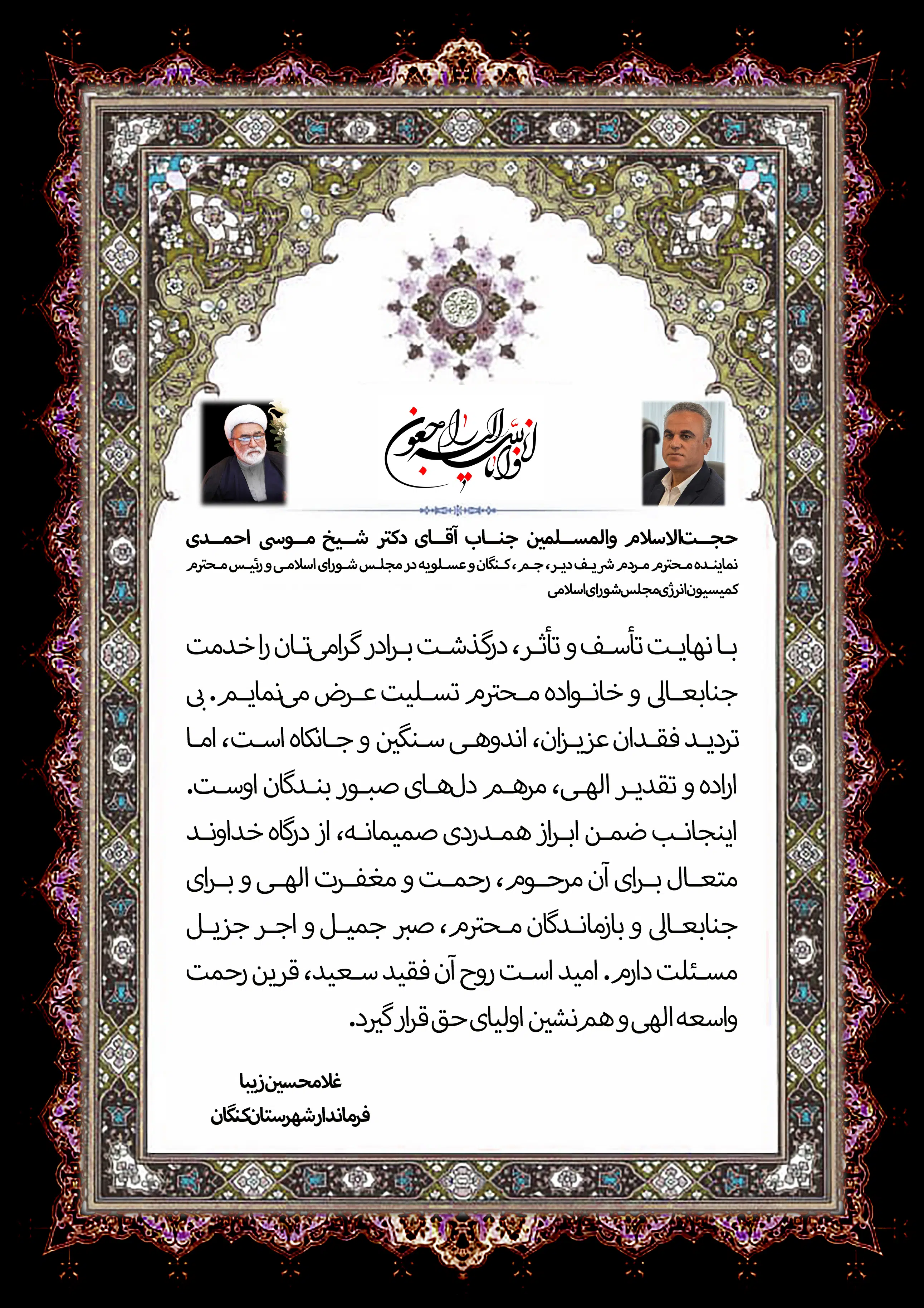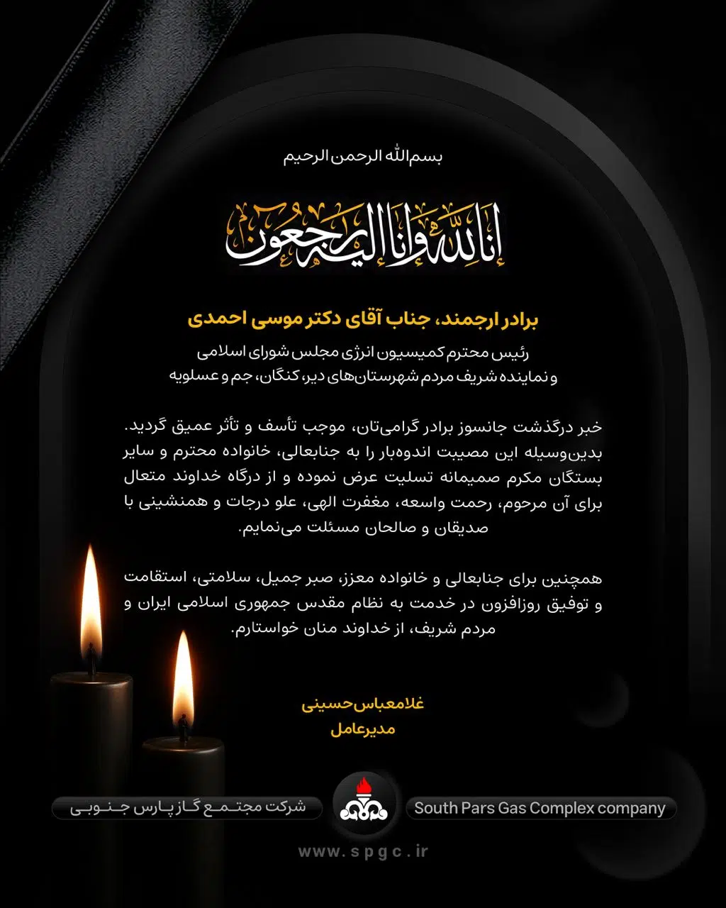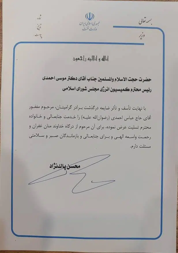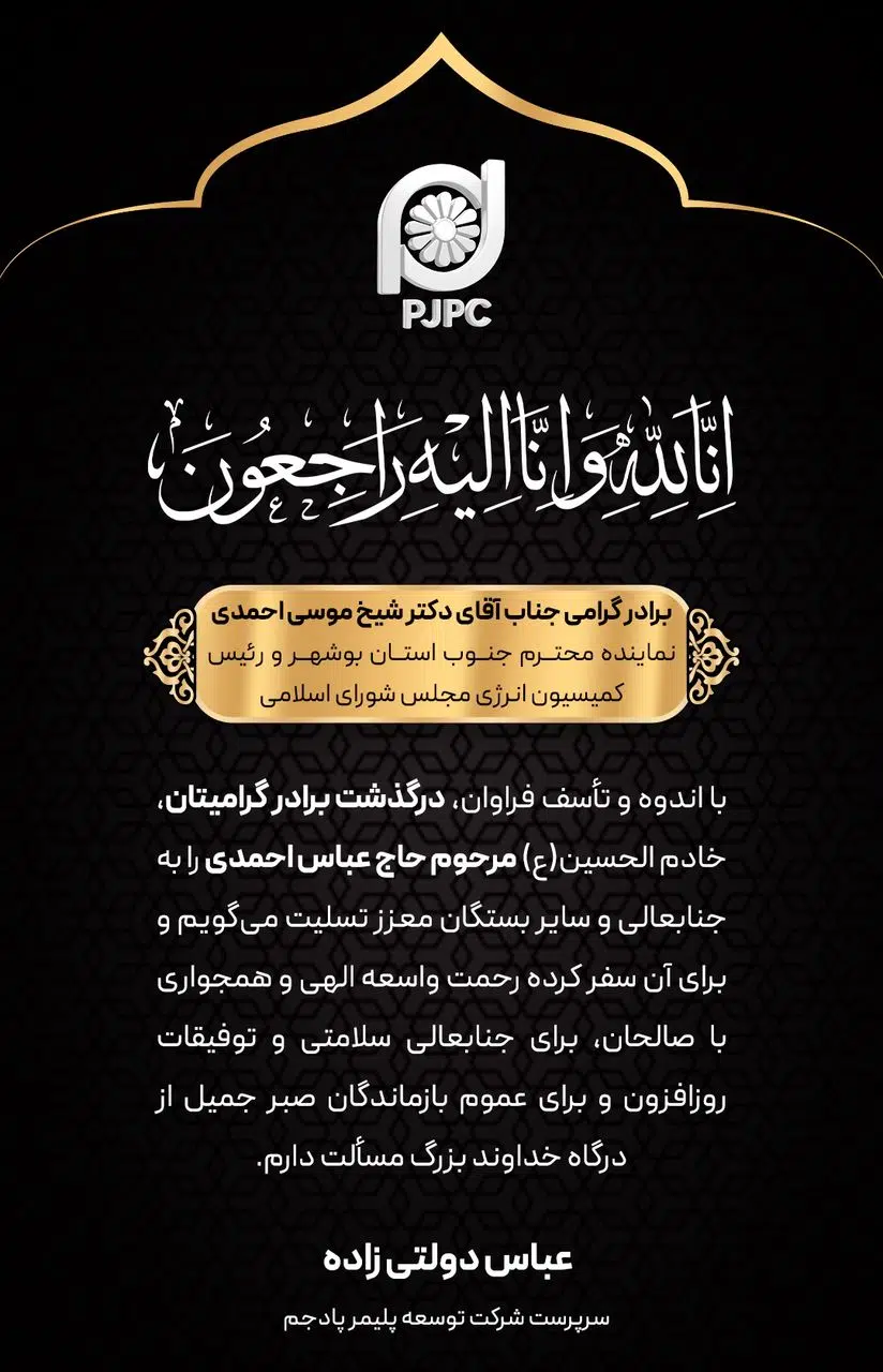 رسانه موج انرژی ضمن ابراز همدردی صمیمانه، این ضایعه جانکاه را به ایشان و خاندان محترم تسلیت عرض نموده و از درگاه حضرت حق، برای آن فقید سعید، رحمت واسعه و علوّ درجات، و برای جنابعالی و بازماندگان معزز، صبر جمیل و اجر جزیل مسئلت مینماید.