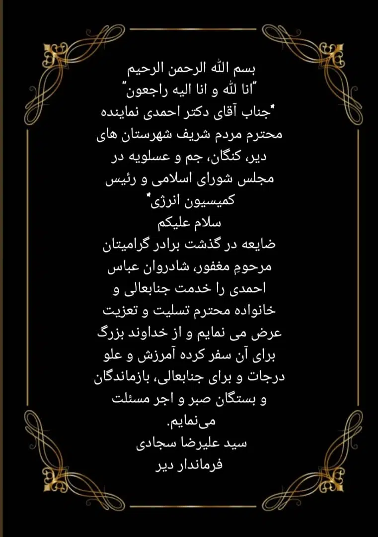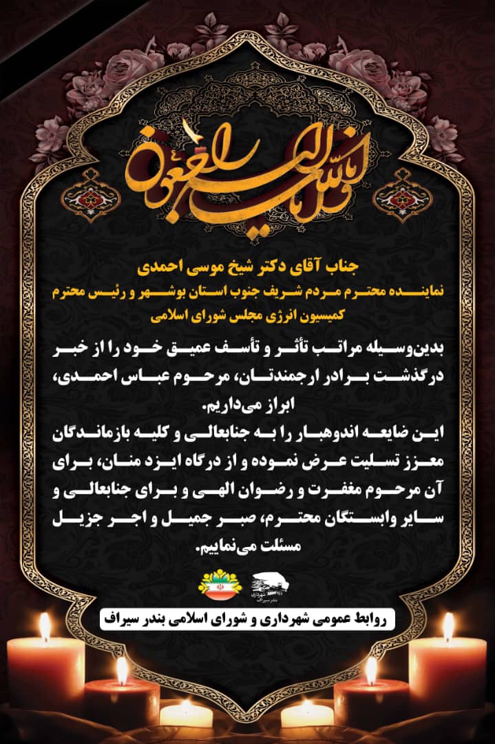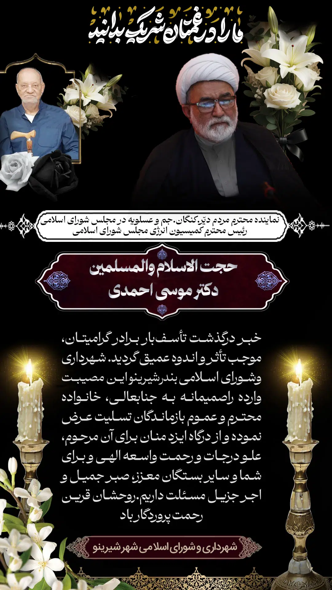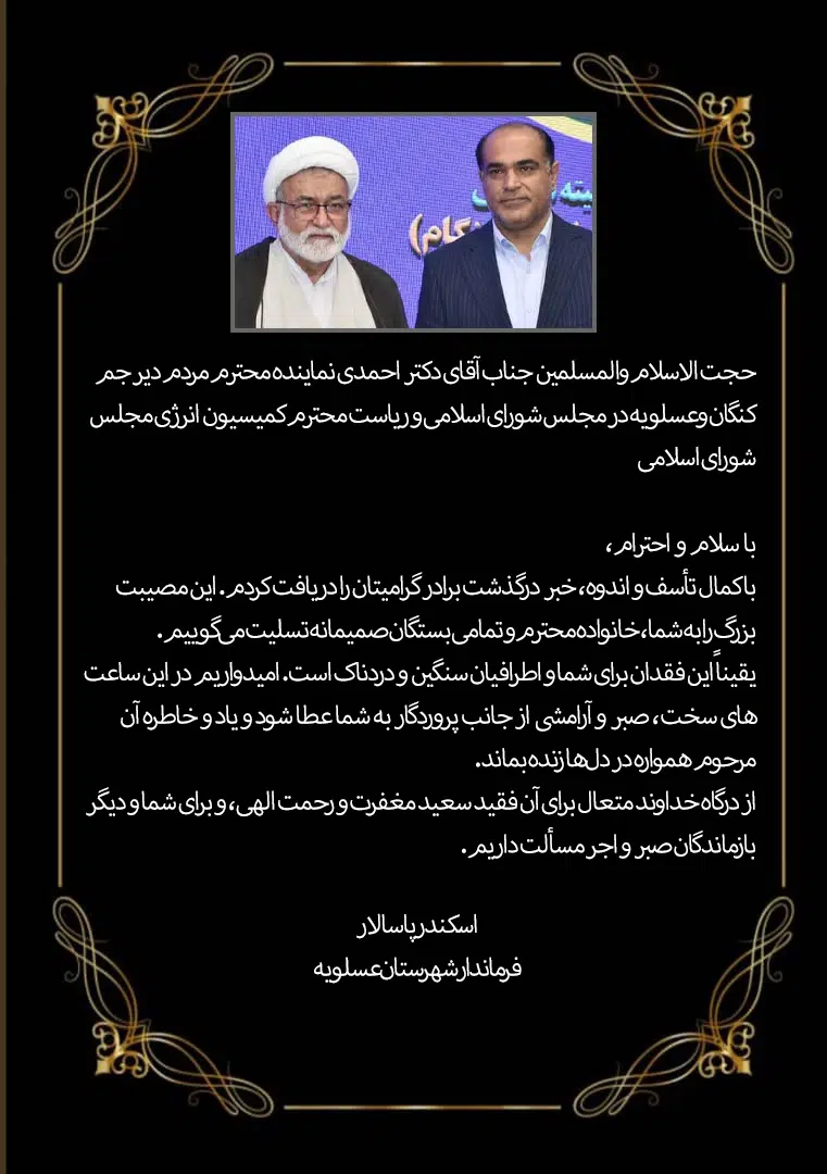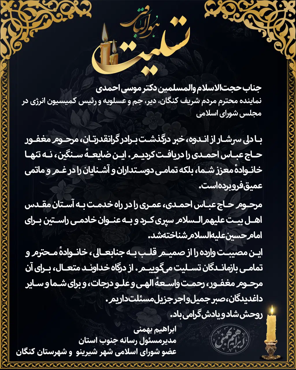 رسانه موج انرژی ضمن ابراز همدردی صمیمانه، این ضایعه جانکاه را به ایشان و خاندان محترم تسلیت عرض نموده و از درگاه حضرت حق، برای آن فقید سعید، رحمت واسعه و علوّ درجات، و برای جنابعالی و بازماندگان معزز، صبر جمیل و اجر جزیل مسئلت مینماید.
